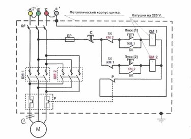 Стоповую кнопку обычно окрашивают в красный цвет. Реверсивная схема подключения электродвигателя через пускатели В некоторых случаях необходимо обеспечить вращение двигателя в обе стороны. При нажатии кнопки СТОП происходит разборки цепи. Если указано напряжение В устройство необходимо подключать к фазному напряжению, то есть к фазному и нулевому проводам.