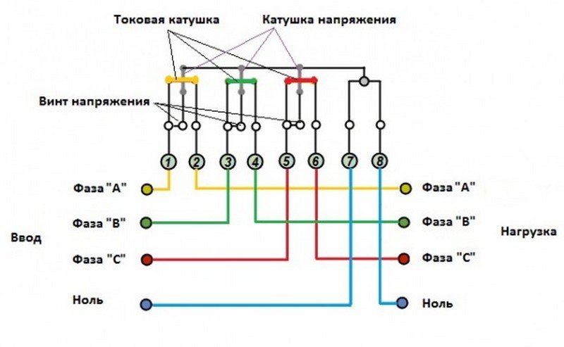 Последовательность подключения такова слева направо : первый провод — фаза А вход , второй — ее выход; третий — вход, а четвертый — выход фазы В; аналогично — 5-й и 6-й провода, соответствующие входу и выходу фазы С, последние два — вход и выход нулевого проводника.