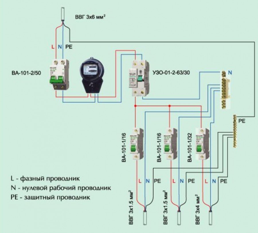Далее монтируются автоматы отходящих присоединений. Каждая из них отличается своими особенностями и требует специальных схем подключения. В сложных схемах электропроводки целесообразно устанавливать несколько ступеней защиты с селективным срабатыванием УЗО меньшего номинала.