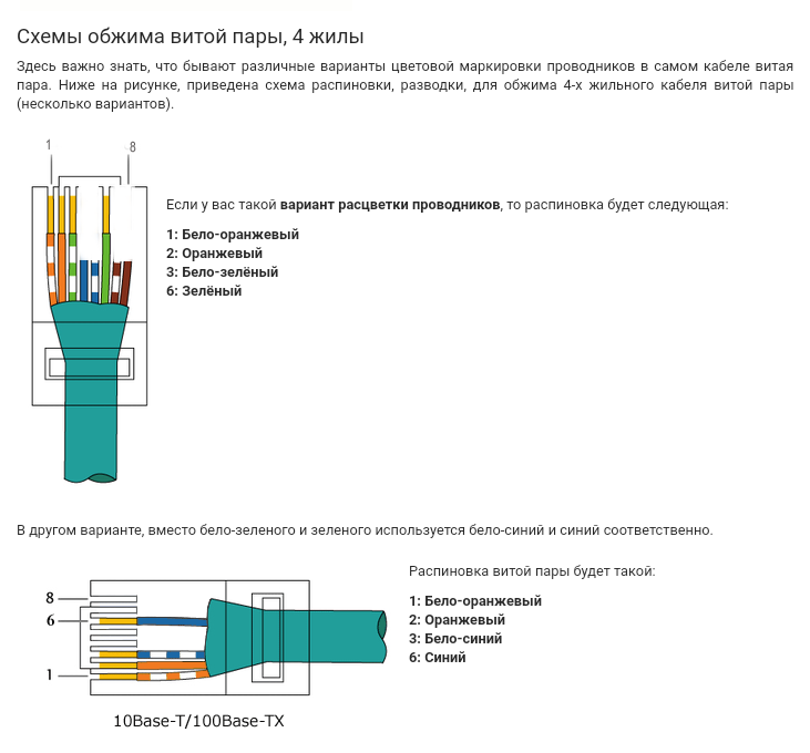 Цветовая схема распиновки витой пары 8 проводов может производиться как по стандарту А когда один и другой концы провода обжаты по типу А , так и по стандарту В когда один и другой концы провода обжаты по типу В. Этот способ наиболее распространенный в нашей стране. Цветовая схема обжима RJ 4 провода компьютер — хаб Обжим витой пары, вариант B.
