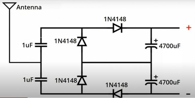 Эта схема предназначена для сбора свободной энергии, т.е. радиочастотной энергии, поступающей от маршрутизаторов Wi-Fi, Bluetooth и т. д.