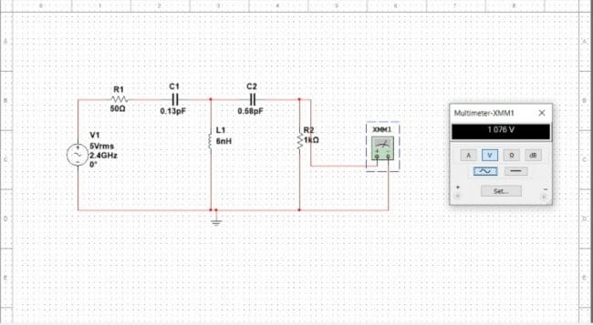 Схема согласования T спроектирована и смоделирована с использованием программного обеспечения Multisim.
